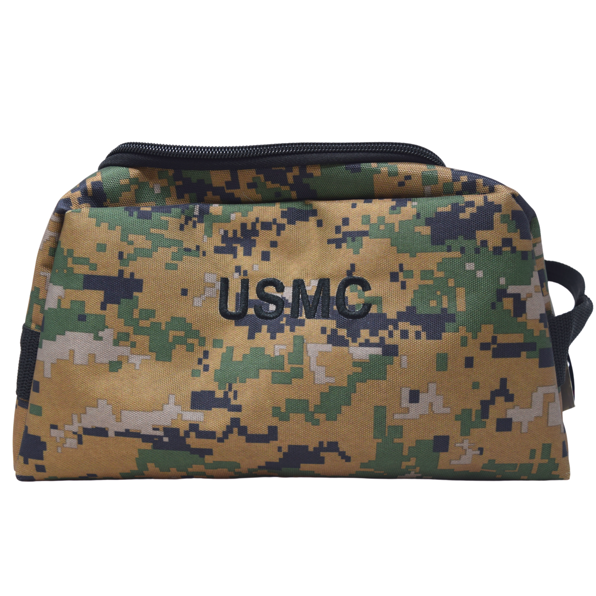 Perfect for small items or toiletries, this digital woodland shaving kit features a hang tag and zipper closure. Each bag also features an embroidered USMC. Order this digital woodland shave kit here!