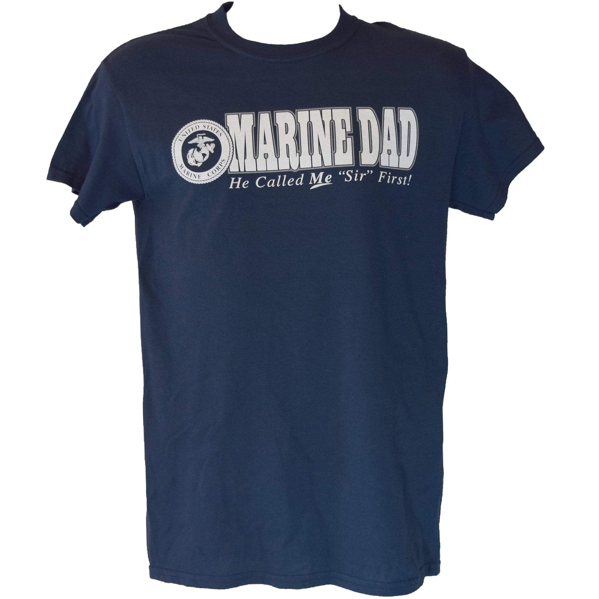 Show your support with the " Marine Dad - He Called Me Sir First" T-shirt. The phrase is written across with a white EGA emblem.