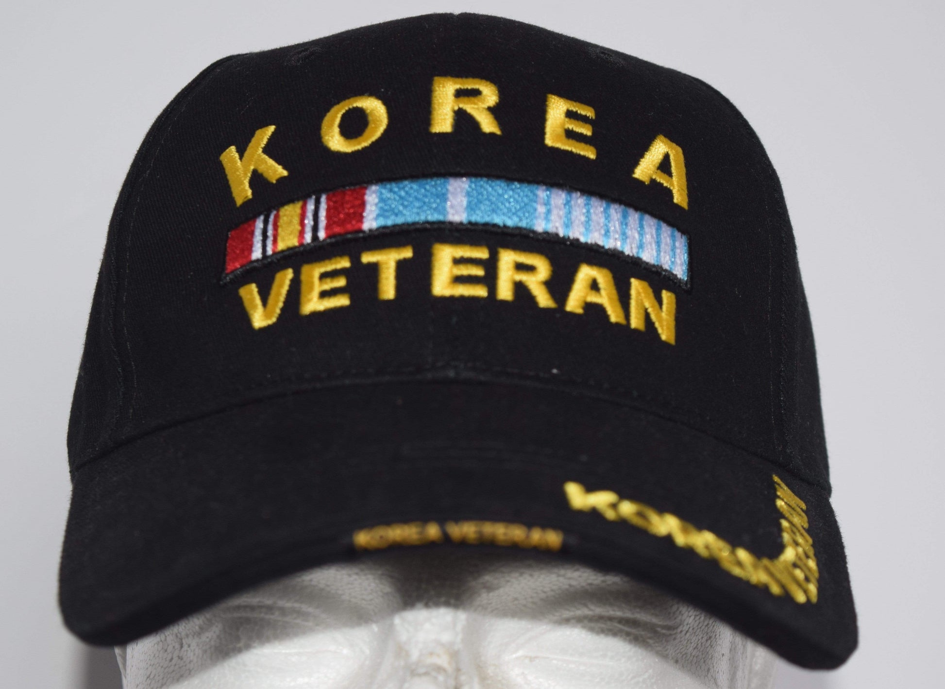 This deluxe hat has "Korea Veteran" embroidered in gold lettering over a ribbon bar, and "Korea Veteran" is embroidered on the bill of the hat in gold.