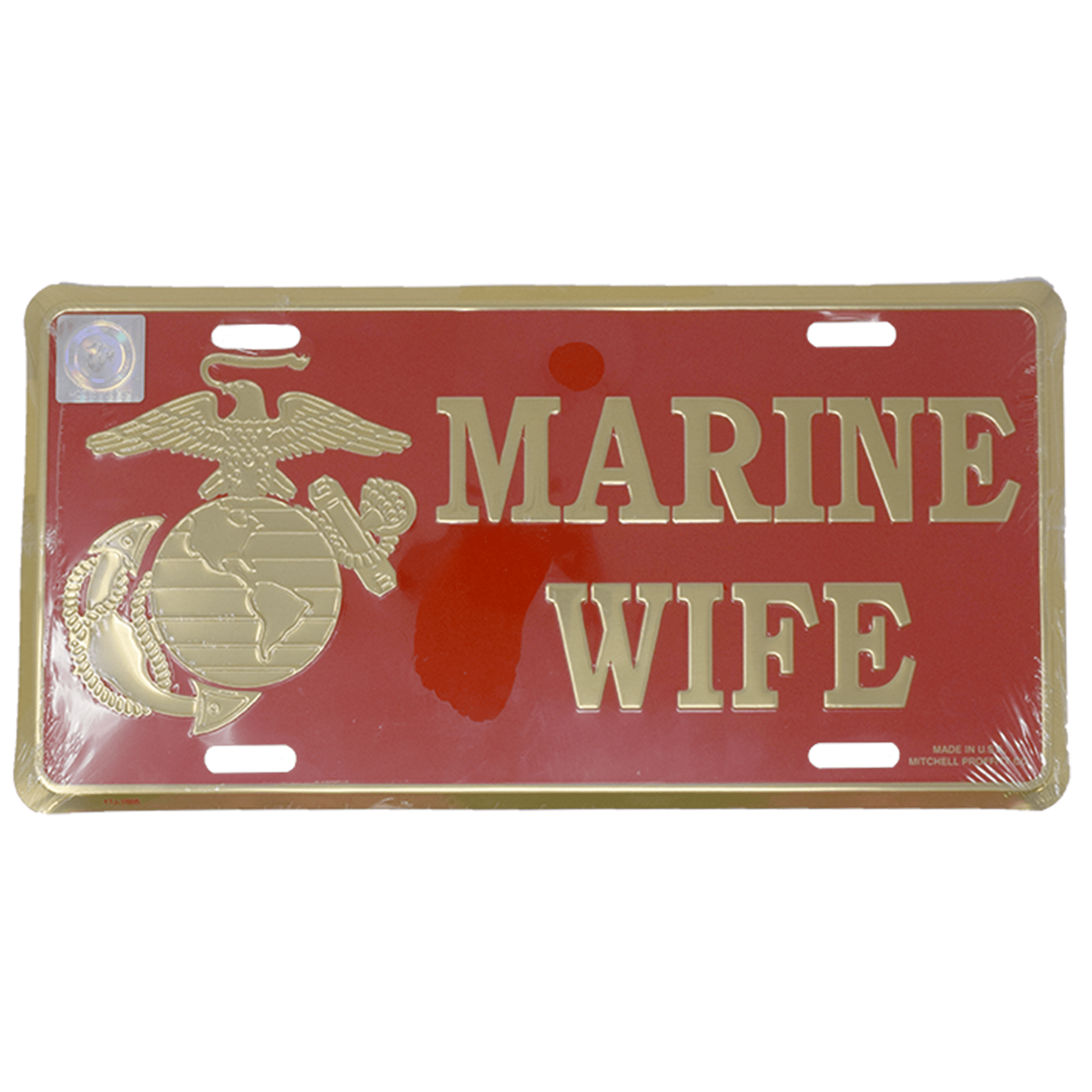 Marine Wife License Plate with Gold EGA Emblem on Red Metal