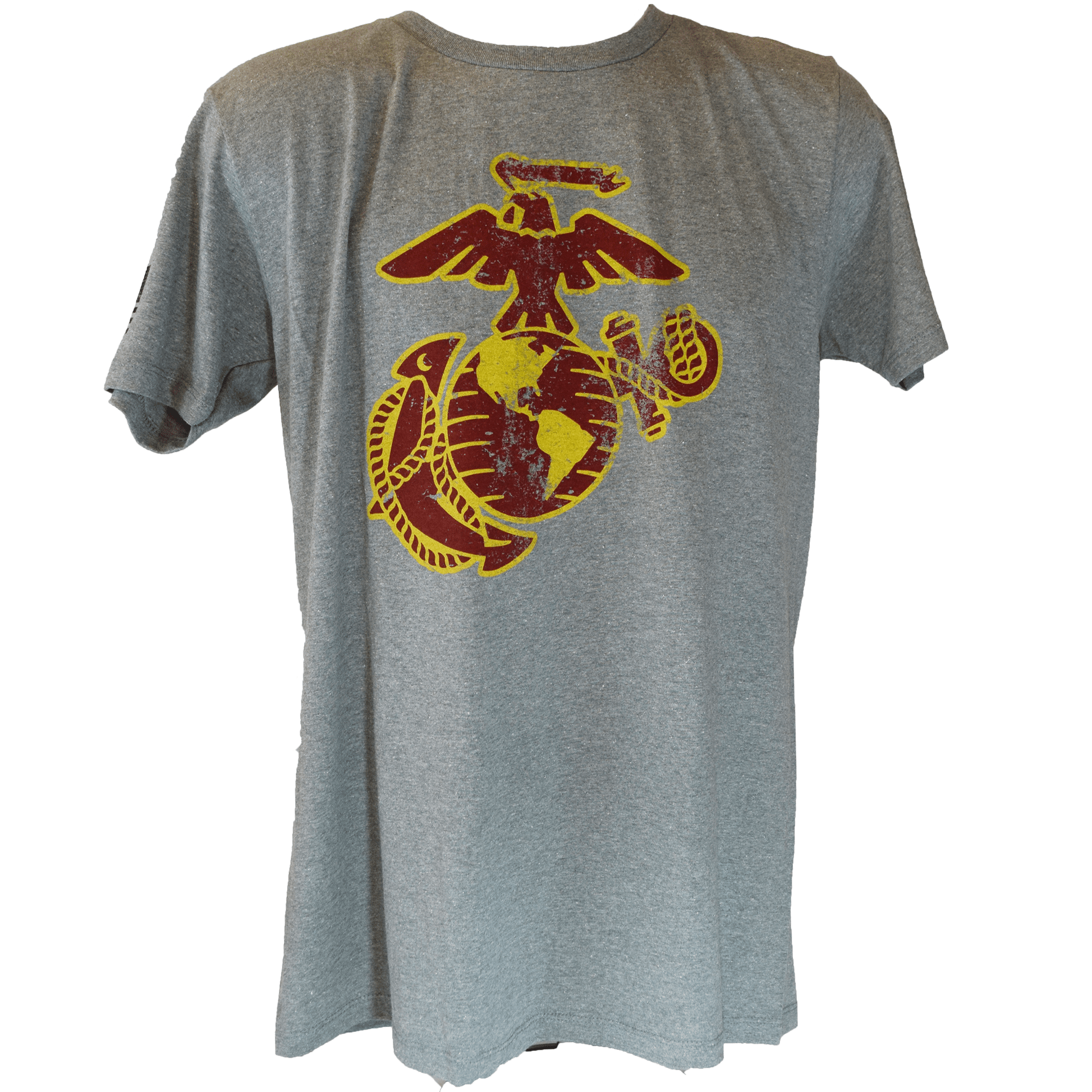 This cool gray shirt features a large red/yellow EGA emblem at the center.