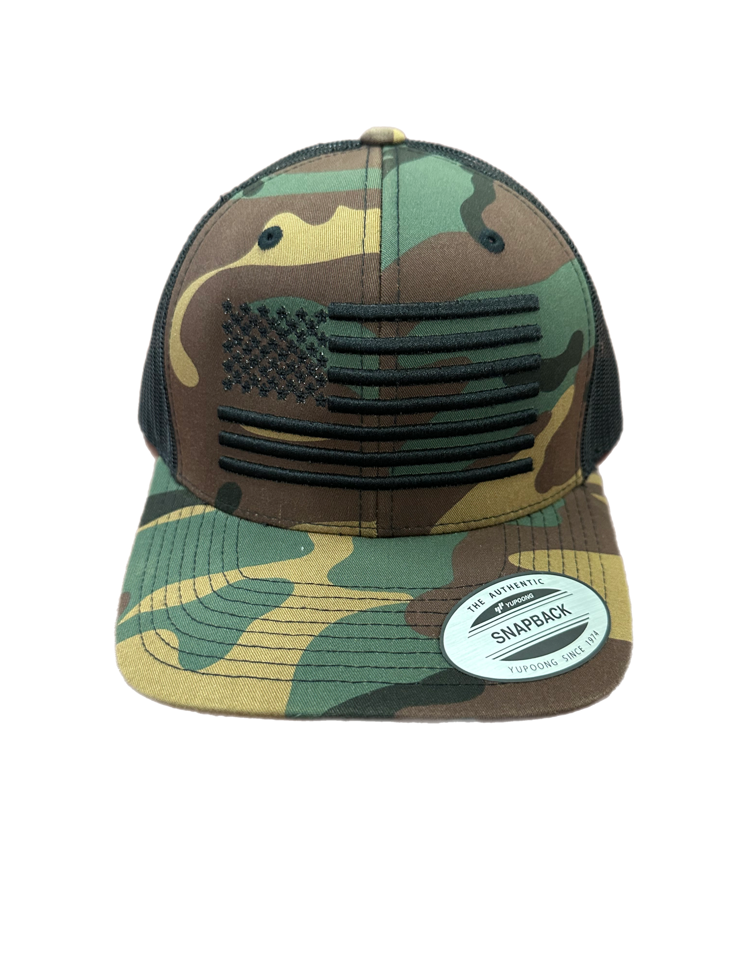 Multicamouflage green and black hat with embroidered US Flag
